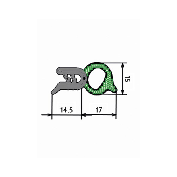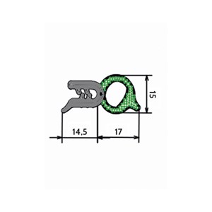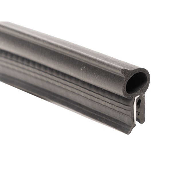 Steel-frame top tube seal, suitable for 1.5-2.0 mm material strength. Applications include doors, hatches and panels in, for example, the vehicle industry. The mounting groove has a comb-like bonding surface. Heat resistance -35°C to + 90°C, and +100°C for short periods.