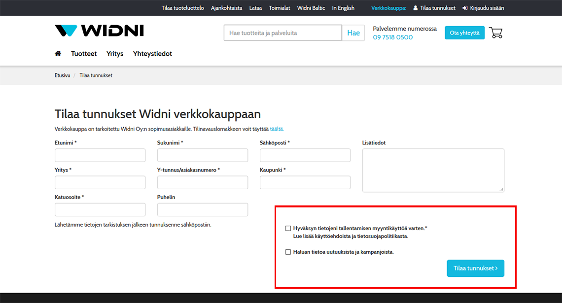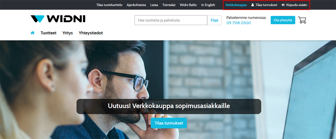 - Verkkokauppa on tarkoitettu Widni Oy:n yritysasiakkaille. Mikäli yrityksellänne ei ole vielä asiakastiliä Widni Oy:ssä, täytä tilinavauslomake verkkosivuillamme Yhteystiedot->Tilinavauslomake.