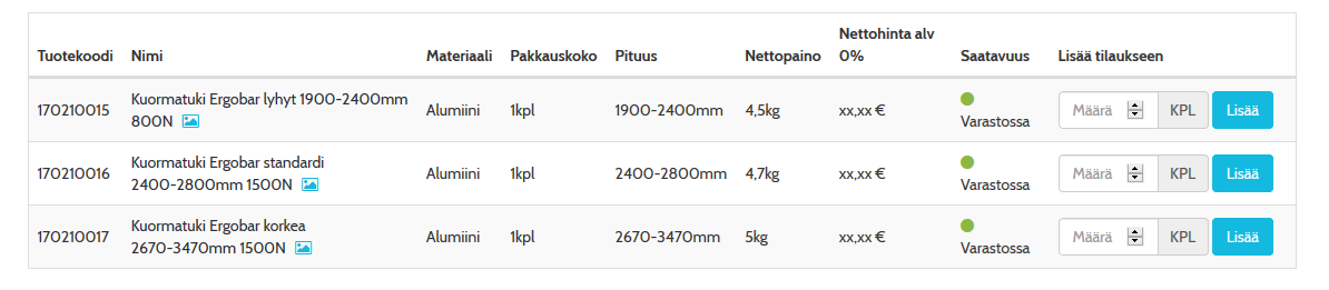 - Tuoteriveiltä löytyy lisää teknistä tietoa, nettohinta ja saatavuus