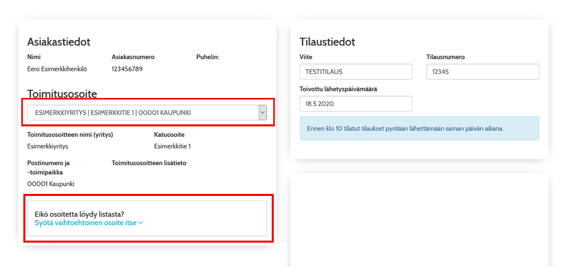- Toimitusosoitekohtaa klikkaamalla näet mahdolliset vaihtoehtoiset toimitusosoitteet mitkä on syötetty järjestelmäämme asiakastietojenne taakse.