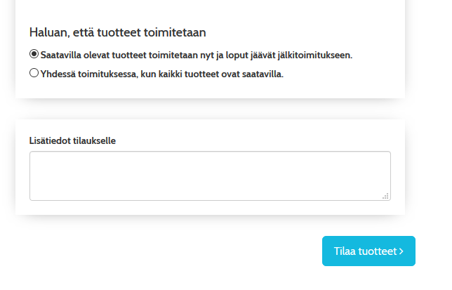 - Voit vielä valita, haluatko koko toimituksen kerralla vai voiko tuotteita jättää jälkitoimitukseen kohdassa ”Haluan, että tuotteet toimitetaan…”.