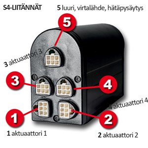 S4 Control Box on suunniteltu käsittelemään jopa neljää karamoottoria ryhmissä, synkronisesti tai yksittäin. Sitä ohjataan langallisella kauko-ohjaimella, joka voidaan toimittaa viidellä eri painikeasetelmalla asiakkaan tarpeiden mukaan. Lisäksi S4 voidaan varustaa hätäpysäytystoiminnolla.