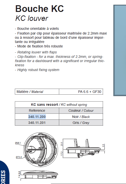 440130 KC ilmansuutin musta 73,4mm Ø PA6.6+GF30 1kpl 16,2mm 22g 73,4mm 68,1mm Musta Pyydä tarjous tuotteesta lisäämällä se ostoskoriin  Saatavilla 20.12.2025