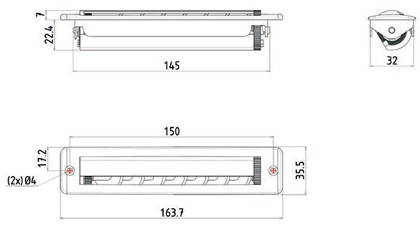 Säädettävä ja suljettava, ruuvikiinnitys. Asennusreikä 145 x 32mm, asennussyvyys 22mm.