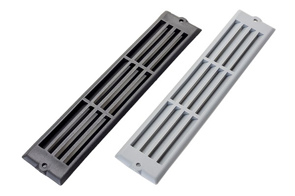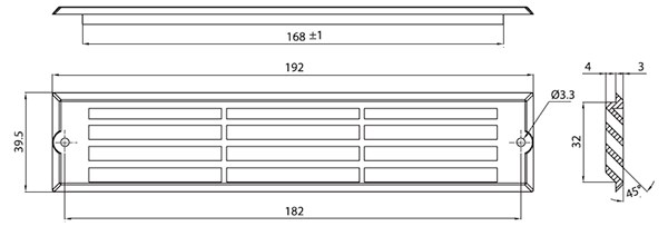 Yksinkertainen ilmaritilä ilman sovitinta. Ruuvikiinnitys. Asennusreikä 168 x 32mm. Asennussyvyys ilmasuutin 4mm, suutin+sovitin 4+68mm.