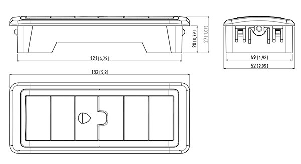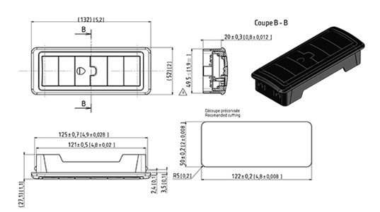 Säädettävä ja suljettava, klipsikiinnitys. Asennusreikä 121 X 49mm, asennussyvyys 20mm.