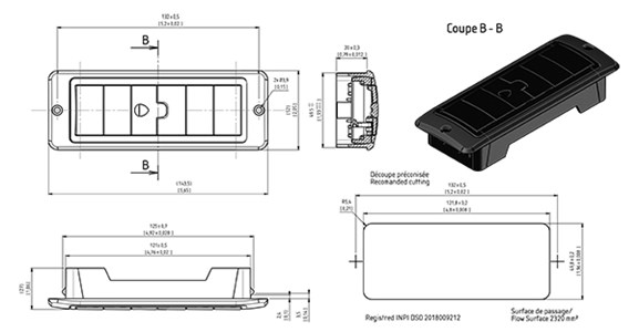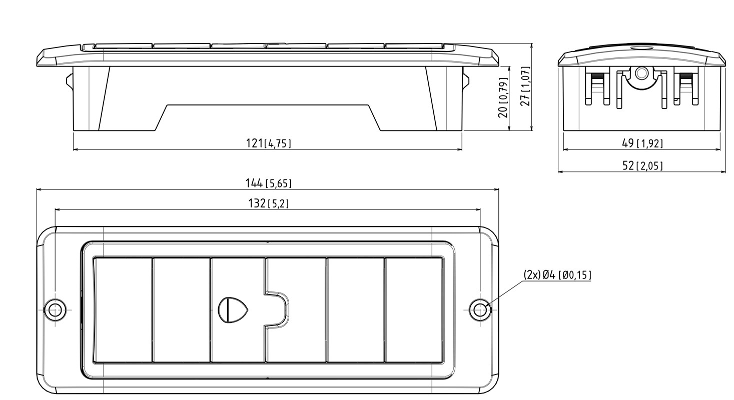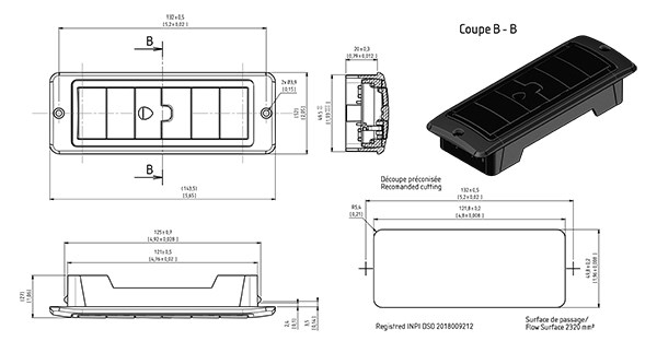 Säädettävä ja suljettava, kromi-reunus ja ruuvikiinnitys.Asennusreikä 121 X 49mm, asennussyvyys 20mm.