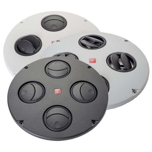 Tuulettimen alaosa pyöreä suljettavilla ja säädettävillä suuttimilla. Saatavana valkoisena, mustana ja harmaana.