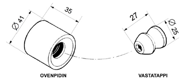 700090 sisältää sekä kumisen ovenpitimen, että vastatapin. Vastatappi (700100) ja ovenpidin (700110 ) saatavana myös erillisinä tuotteina. Ovenpidin kumia, pohjaan vulkanoitu teräsvahvistus. Korkeus tapin kanssa 40mm. Tappi mustaa muovia. Sekä tapin, että kumin kiinnitysreikä halkaisija 6mm.