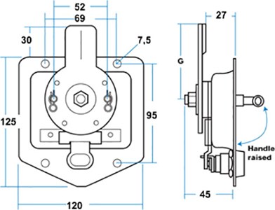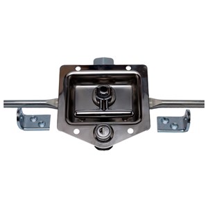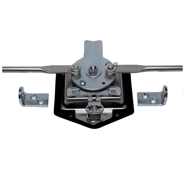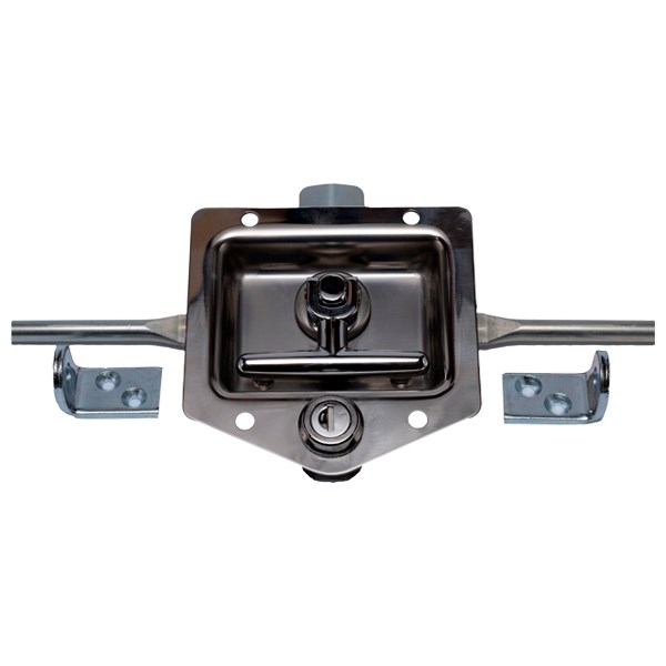 Nivelöidyllä T-kahvalla. Kahva kromattu. Sisältää lukkosylinterin, kaksi kappaletta keltapassivoituja tankoja (L=1150mm, halkaisija 10mm) ja kaksi kappaletta ohjureita. Tankojen liikerata 25mm. Vara-avain FS880 lukkoon 300560.