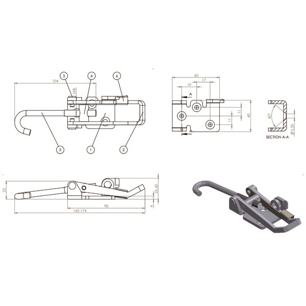 Valmistettu sinkitystä ja kirkaspassivoidusta teräksestä, joka tarjoaa hyvät korroosionkestävyysominaisuudet. Pohjalevyssä 80 asteen senkatut reiät, jotka soveltuvat sekä ruuvi, että niittikiinnitykseen. Salvassa lukittavissa + turvalukitsin.