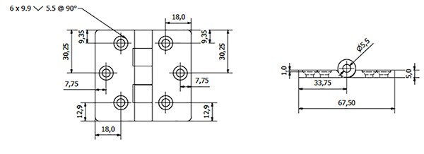64 x 67.5 x 5mm musta sarana vahvistetusta nylonista. Rei'itetty, suunniteltu aukeavaksi 240°.