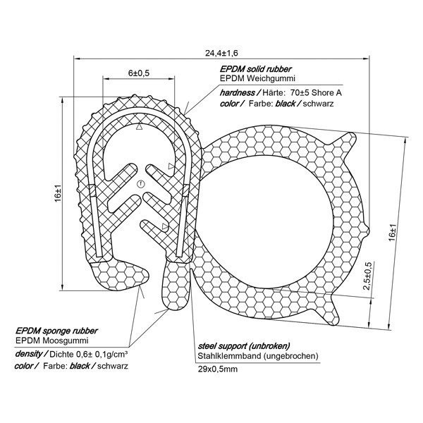 Teräsrunkoinen tiivistenauha sivupussilla, 2,0-4,0mm ainevahvuudelle. Käyttökohteet ovet, luukut ja levyt esimerkiksi ajoneuvoteollisuudessa. Jäykkä teräs runko. Materiaali EPDM. Lämmönkestävyys -35°C - + 90°C.