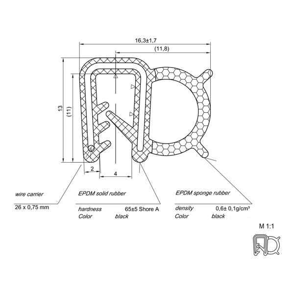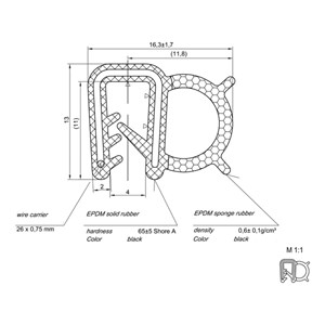 Tiivistenauha sivupussilla 2,0 mm ainevaihvuudelle. EPDM. Vaijerirunko.