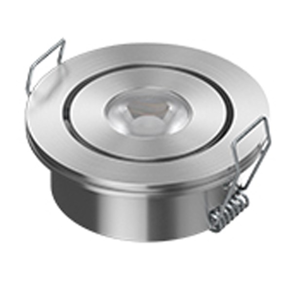 LED spotti sisävalo. Yhteen suuntaan säädettävä/suunnattava. Upotusasennus, pinnalle jäävä osa vain 3,5mm paksu, upotussyvyys 25mm. Teho 2,5W.