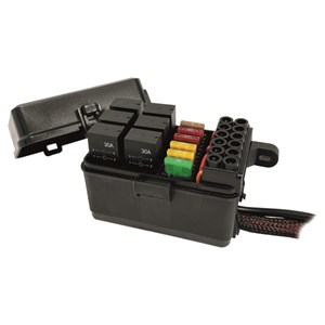 Kaksipuolinen 3M teippi sekä asennusteline ohjausyksikköä varten. Kytkentärasiassa paikka 6:lle releelle ja sulakkeelle, mukana toimitetaan 12V ja 24V releet, sulakkeet sekä varasulakkeet.